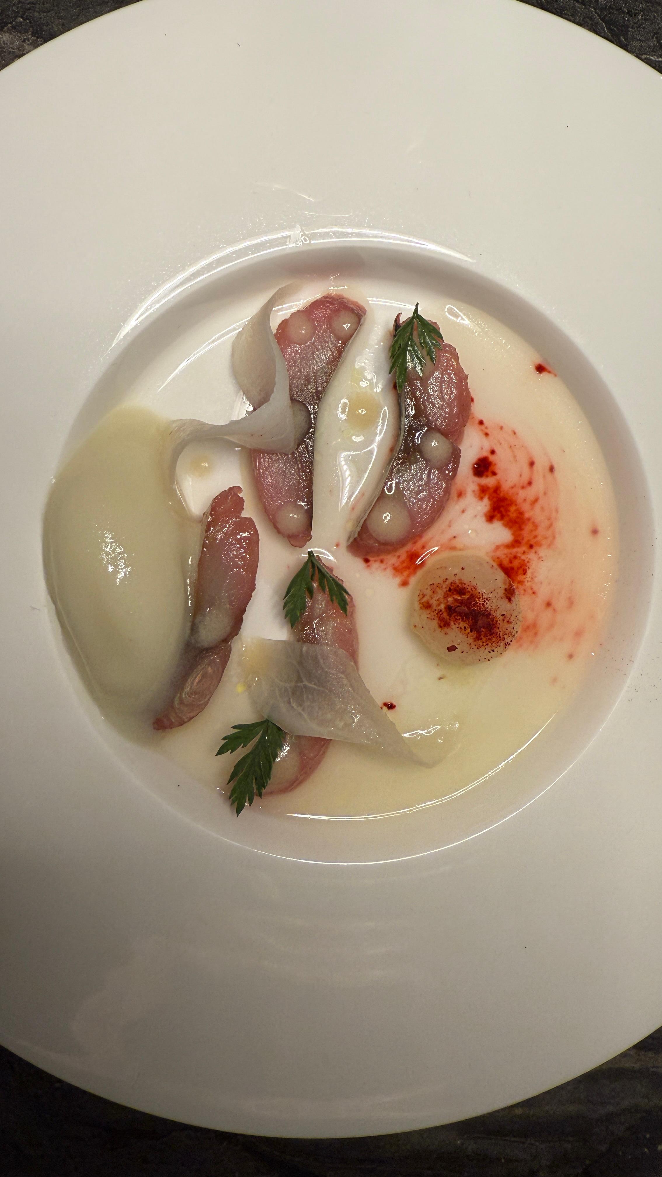 Il nostro tour all'insegna delle specialità enogastronomiche della Tuscia parte dal caratteristico borgo di Sutri. Uno degli chef più giovani della Tuscia in uno degli indirizzi più in rampa di lancio del territorio. Da un anno e mezzo il nome di N'uovo Vino e Cucina è stato inserito nella Guida Michelin: una segnalazione che, chissà, magari in futuro non possa diventare qualcosa di più grande. Situato all'interno de l'Antico Borgo di Sutri, un suggestivo relais nel cuore della Tuscia, N'uovo Vino e Cucina nasce dal sogno condiviso dei proprietari Francesca Pozzi e Federico Fortin. Ricavato tra le colline e i siti storici della città, a egual distanza da Viterbo e Roma, il ristorante propone un'esperienza enogastronomica che unisce materie prime locali, tecniche di cucina moderne ed ancestrali (bell'utilizzo della cottura alla brace) e un'identità “glocal” ben definita. Allo chef Simone Lezzerini, romano classe 1996 con esperienze in importanti cucine (tra cui spicca quella dell'Enoteca La Torre a Roma), è affidato il timone della brigata fin dal 2023. La sua proposta gastronomica bilancia tradizione contadina, radici romane e creatività contemporanea, con piatti dal forte legame territoriale e lavorazioni raffinate nate dall'unione tra tecniche d'avanguardia e più legate al mondo rurale. N'uovo si distingue per l'atmosfera intima e raffinata: luci soffuse, ampie vetrate aperte sul verde circostante, tavoli in legno e cura dei dettagli, perfettamente integrati in un “teatro naturale” tra storia e paesaggio. Tra i signature dello chef, l'uovo alla brace con cardoncelli, crema di funghi anch'essi alla brace e tuorlo stagionato al fieno. Più delicato lo sgombro marinato con daikon e un gradevole sorbetto al finocchio. Notevole la zucchina romanesca in tempura simil scapece, con aceto e gel di mele. Si passa dalla freschezza alla rotondità con il primo, un bel raviolo allo zafferano ripieno di pecorino e accompagnato da coniglio leprino locale e il suo fondo. Cacciagione protagonista nel secondo: fagianella con culatello di maialino orvietano e un ghiotto fondo aromatizzato con chiodi di garofano. Notevole il dessert con l'albicocca protagonista, mandorla e liquirizia.